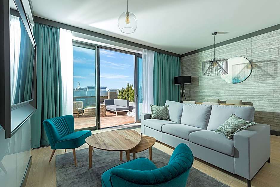 The hotel offers a variety of rooms including Junior and Senior Deluxe double rooms with queen size beds, Superior Family rooms with queen size beds, Basic and Comfort apartments with sofa beds or double beds, Suites with Spa Baths and Suites with Terraces featuring queen size beds and sofa beds, Superior King rooms with twin and queen size beds, Family One and Two-Bedroom Apartments with queen size beds and sofa beds. All rooms are non-smoking and have different occupancy limits ranging from 2 adults and 0 children to 5 adults and 3 children.