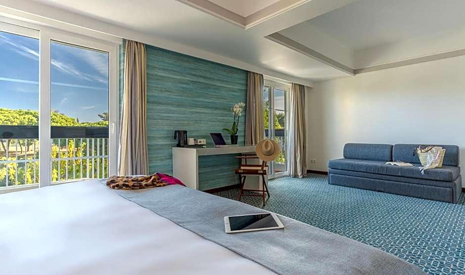 The Pestana Alvor Praia Premium Beach & Golf Resort offers a variety of room types including Double or Twin Rooms, Duplex Suites, Triple Suites, Studios, and Superior Triple Rooms. All rooms have a no-smoking policy and accommodate either 2 or 3 adults, with some rooms also allowing for 1 or 2 children. Beds range from double, twin, queen size, and sofa beds, and room sizes vary from 280 sqft to 624 sqft. Some rooms offer garden views while others offer sea views.