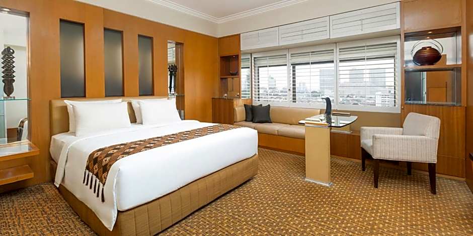This spacious room features ample workspace, seating area and a private bathroom with granite bathtub and walk-in shower.