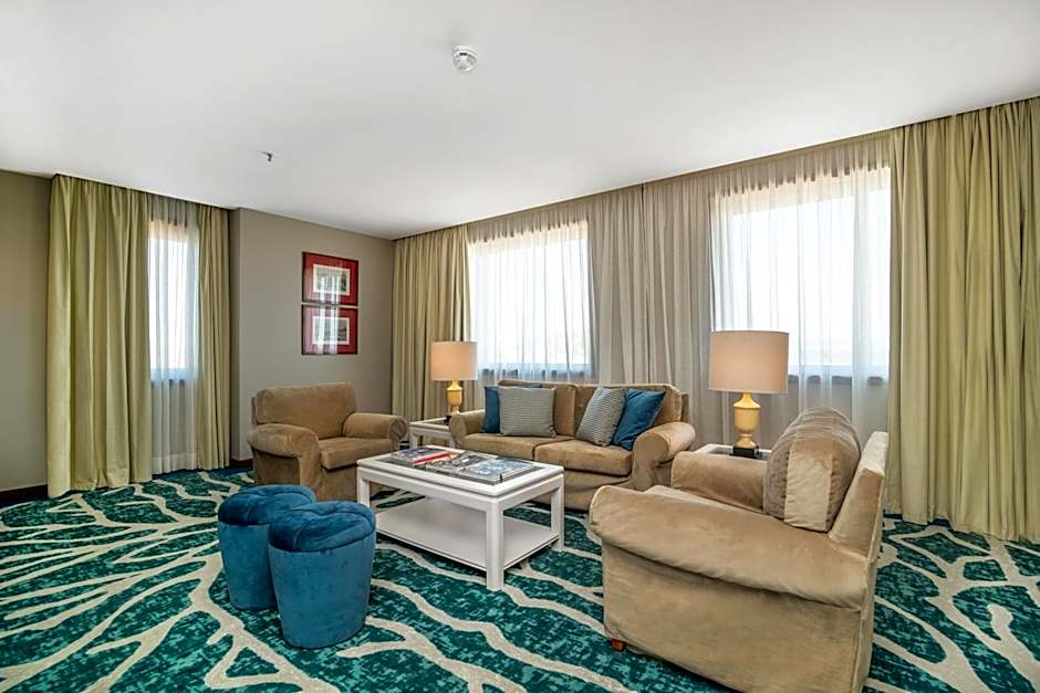 The Holiday Inn Porto Gaia offers a variety of rooms including Standard Twin Rooms with River View and Twin Premium River View, both with 2 twin beds. Suite options include the One-Bedroom Duplex Suite with a queen size bed and the Twin Suite with Sofa Bed and River View. There are also Standard Queen Rooms with River View and Premium Rooms available. All rooms have a maximum occupancy of 2 adults and 1 child and smoking is not allowed. Bed sizes range from twin to double to queen.
