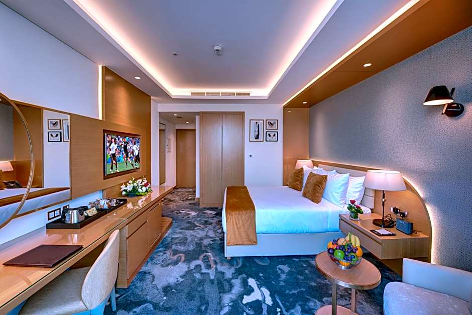 Os quartos estão equipados com ar‑condicionado, opções para não fumantes e interiores insonorizados, com algumas unidades oferecendo varandas e vistas. As comodidades incluem banheira, amenidades de banho gratuitas, solário, terraço e insonorização; a acessibilidade é garantida por acesso para cadeiras de rodas e elevador. Para famílias e roteiros, há buffet infantil e refeições para crianças (gratuitas), além de um balcão de turismo para ajudar a planear as aventuras em Dubai.