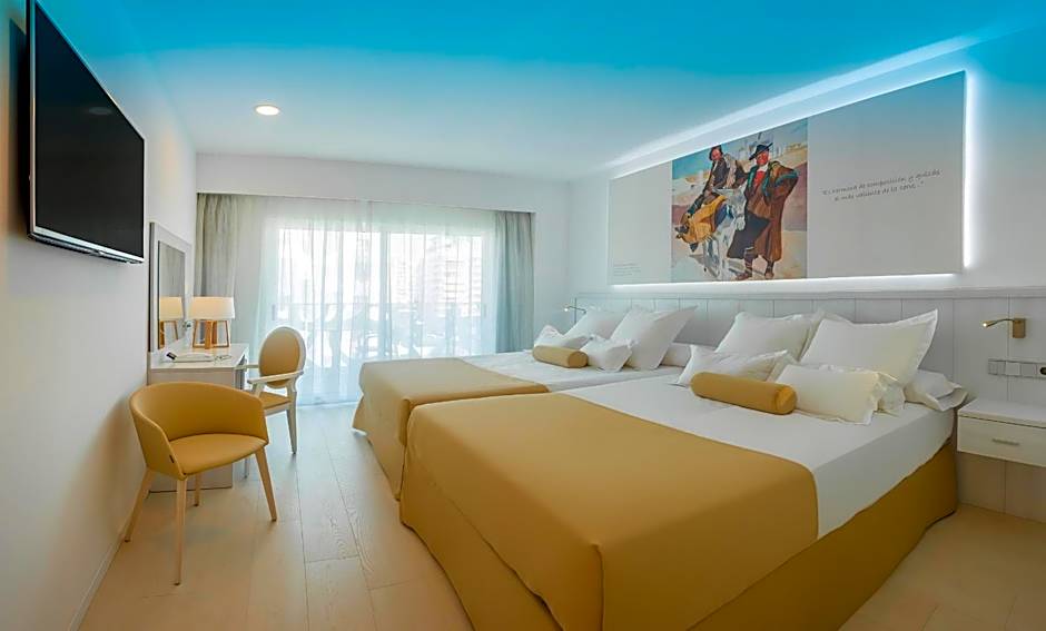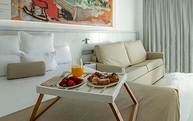 As comodidades incluem Aceita animais de estimação (taxas extras), Clube infantil (gratuito), Restaurante, Piscina ao ar livre (gratuita), Piscina infantil (gratuita), Wi‑Fi (gratuito), Escorrega aquático, Praia, Ar condicionado, Buffet para crianças, Bar, Solário, Terraço, Recepção 24 horas, Espreguiçadeiras/cadeiras de praia, Elevador, Parque infantil, Jardim, Varanda e Banheira.