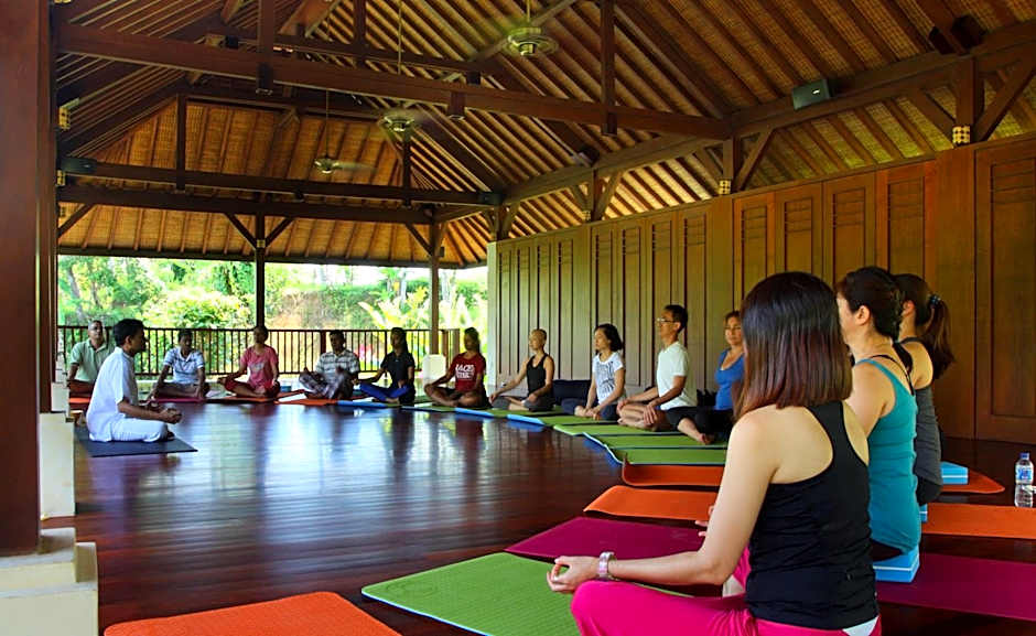 As acomodações variam de suítes íntimas a villas espaçosas, com opções notáveis como Dedari Suite, Honeymoon Dedari Suite, Teakwood House Villa e Sattvaa Pavilion Villa. A Suite com Acesso à Piscina oferece entrada direta para a piscina para um toque de privacidade, e muitas unidades possuem entradas privativas, além de terraços ou varandas. Os quartos estão equipados com ar-condicionado e banheira de hidromassagem, com vistas que vão desde montanhas e rios até jardins e pontos de referência.