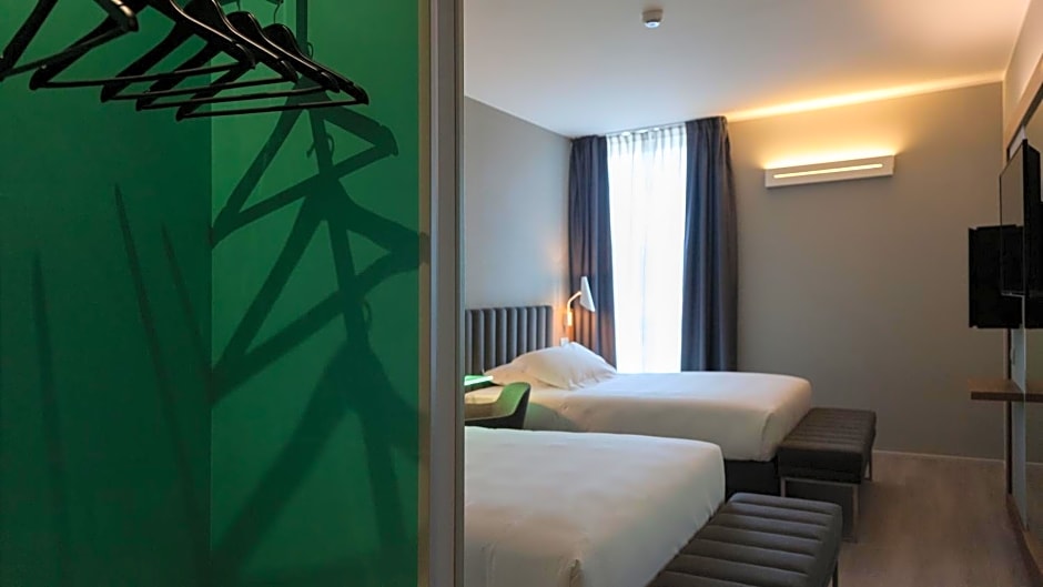 This was a perfect hotel for our overnight stop on a long roadtrip between Italy and France. The hotel is cute and cheerful in terms of design. The staff was nice and helpful. The service is simple with a smile. The breakfast was good and offered a lot of choices. As usual, in this region the non gluten and non dairy options are limited, yet there are few options: fruits, gluten free packaged breads/crackers, jams etc. There is no option for ordering an omelette of your choice or even hard boiled eggs, but that is typical for a lot of non full service hotels. We were okay with that since we were looking for a hotel with a nice and comfortable atmosphere and that was clean with breakfast. The location is good too since it is a few minutes walk from the center where we had dinner. The restaurant was recommended by the hotel and the food was good. The room was comfortable. We had two full size beds for us and our child. There is not a lot of closet space or dressers for cloths, but we did not need it. Parking is on the property of the hotel and very convenient too.