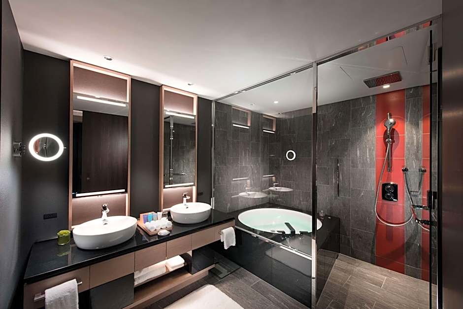 Bem-vindo ao luxuoso Conrad Osaka, onde a opulência encontra o espírito vibrante do Japão! Situado no encantador distrito da Nakanoshima Festival Tower, este tesouro cinco estrelas fica a apenas 0,4mi do centro da cidade, pronto para você explorar as delícias de Osaka. Com quartos a partir de $434 por noite, garantimos uma estadia que não é apenas uma fuga, mas uma experiência repleta de conforto e elegância.