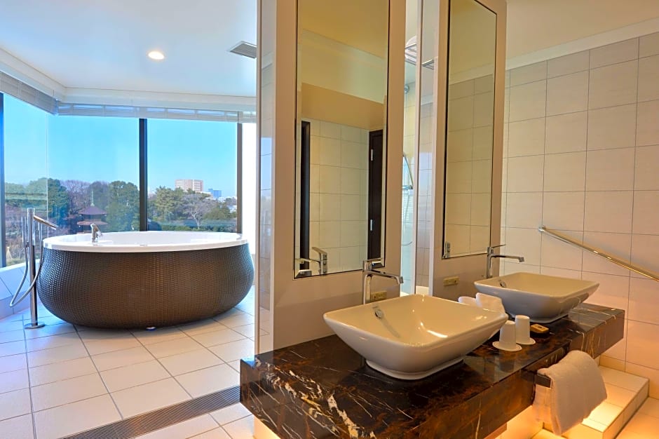 Great room (we paid for an upgrade to a 60 m2 room, which was worth it for 3 people), comfortable beds, even the portable bed was good. Huge bathroom, with a tub and a large shower cabin. Great breakfast, served at the table (no buffet). Several restaurants on site, we did not try them all (the fancy kaiseki restaurant needs to be booked >3 days in advance), but the tepan yaki was excellent, the japanese and western restaurants were quite good too. Quiet location, adjacent to a beautiful park.