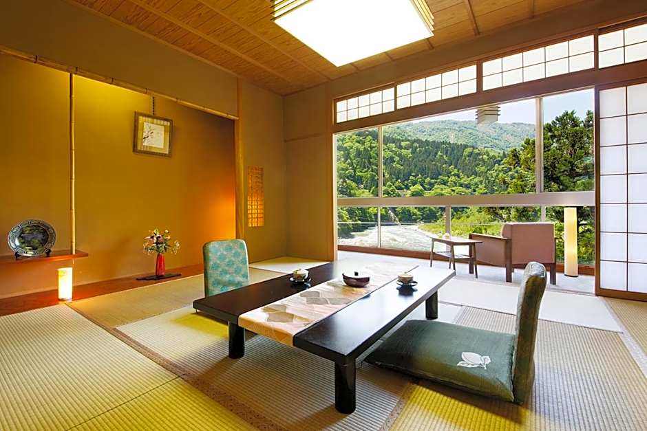Uma variedade de quartos atende a diferentes estilos e tamanhos de grupo, desde a Suíte Estilo Japonês com Vista para o Rio até Quartos Standard e opções Estilo Japonês-Ocidental com duas camas de solteiro. Há opções em andares altos como Deluxe, Twin, River View e diversos quartos de canto com vista para o rio ou lago, incluindo um quarto familiar em estilo japonês com 215 sq ft (aprox. 20 m²) e cinco futons. Os andares superiores são acessíveis por elevador, facilitando apreciar o panorama do rio e das montanhas a partir de um local confortável.