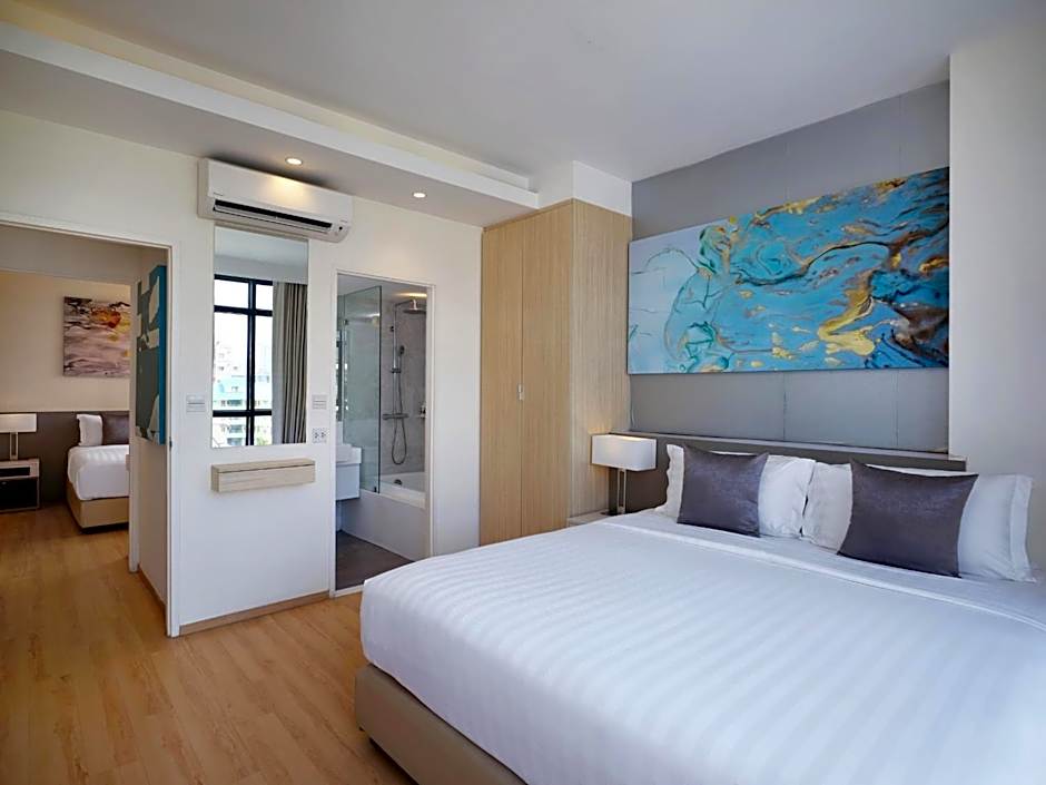 As acomodações abrangem uma variedade de opções, incluindo quartos Deluxe (com variantes como Deluxe Pool View e Deluxe City View), Quarto com Vista para o Mar e várias suítes, como Executive Suite e Family Suite. Há configurações que atendem a diferentes tamanhos de grupo, incluindo quartos que acomodam até seis adultos e três crianças.