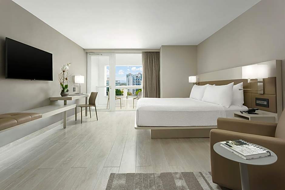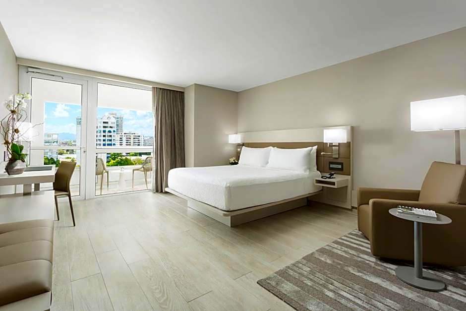 The AC Hotel by Marriott San Juan Condado offers various types of rooms, including one-bedroom king suites with a sofa bed, one-bedroom king suites with a sofa bed and balcony, one-bedroom king suites with a balcony, and king executive rooms with a balcony. All rooms have a non-smoking policy and accommodate up to 4 adults and 3 children. The beds available vary between king size beds and sofa beds.