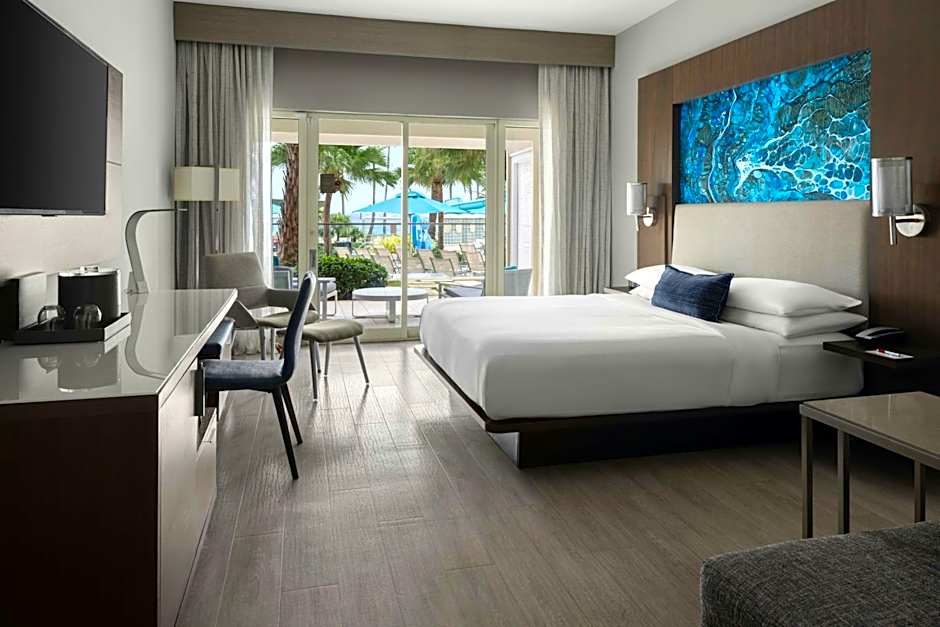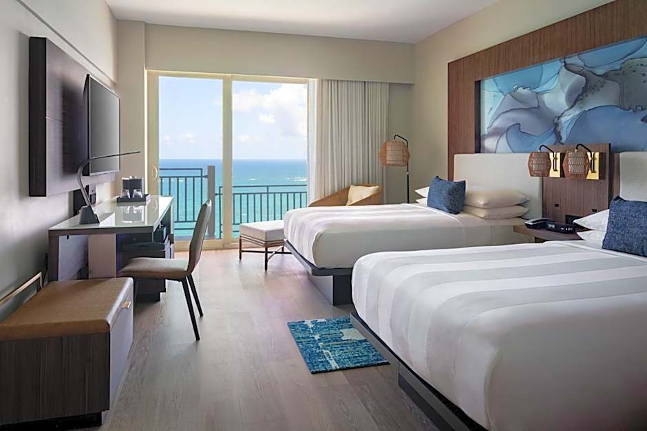 The San Juan Marriott Resort and Stellaris Casino offers various types of rooms including Ocean Front Rooms with two double beds or a king bed, Corner Ocean View Rooms with two double beds, King Cabana Lanai with pool access, Ocean View Rooms with two double beds or a king bed, Double Rooms with two double beds and accessibility features, King Corner Larger Ocean Front Rooms, Presidential Suite, Double Rooms with two double beds and roll-in shower accessibility, Ocean View Rooms with cabana wing, King Studio Suites with city and pool view, King Studio Suites with sofa bed and pool view in the Cabana Building, King Corner Larger City View Rooms, City View Rooms with two double beds, and City View Rooms with a king bed. These rooms accommodate various numbers of adults and children, have non-smoking policies, and range in size from 248 sqft to 624 sqft.