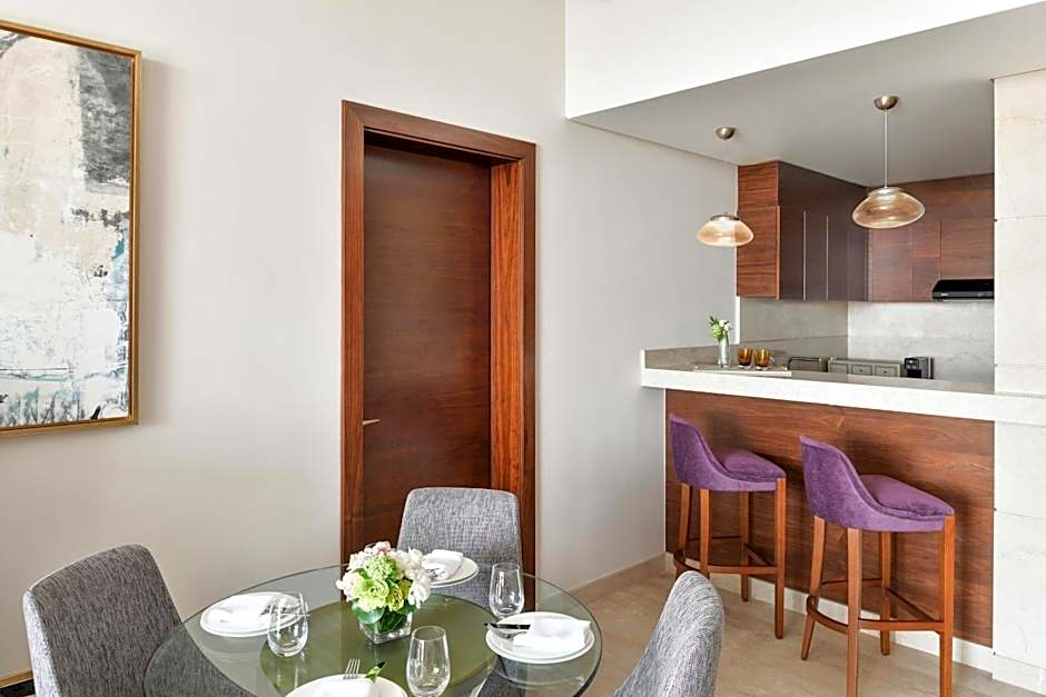 Featuring a furnished balcony overlooking the pool, this suite includes a bedroom, a separate a living area, an equipped kitchenette and a marble bathroom with both shower and bath tub.