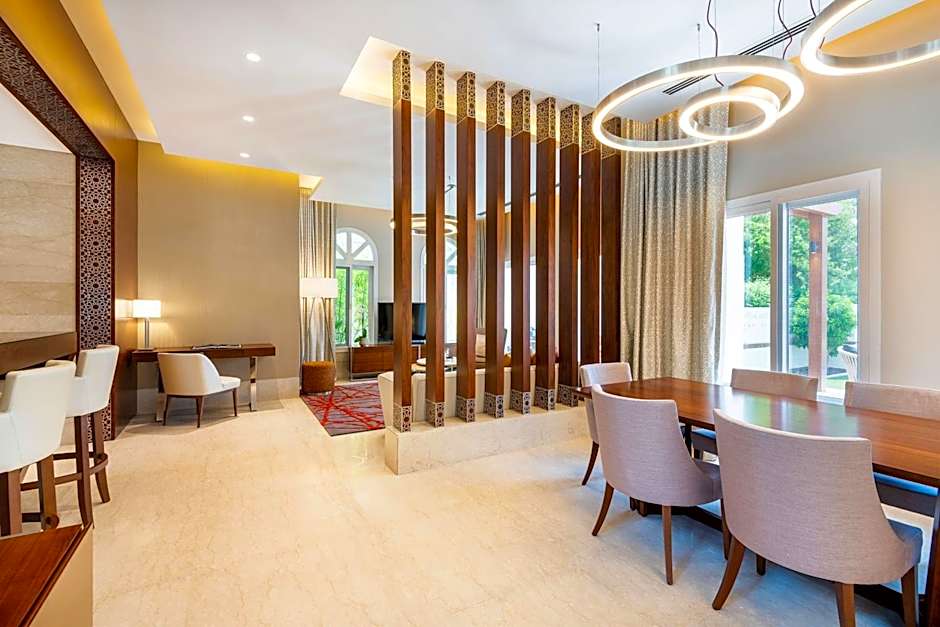 When it comes to dining, the hotel has a variety of restaurant options including Deli Kitchen, Al’Amma, Wa'ha, Parisa Al Messila, Veritas, and Elixir, offering cuisines ranging from international to Italian.