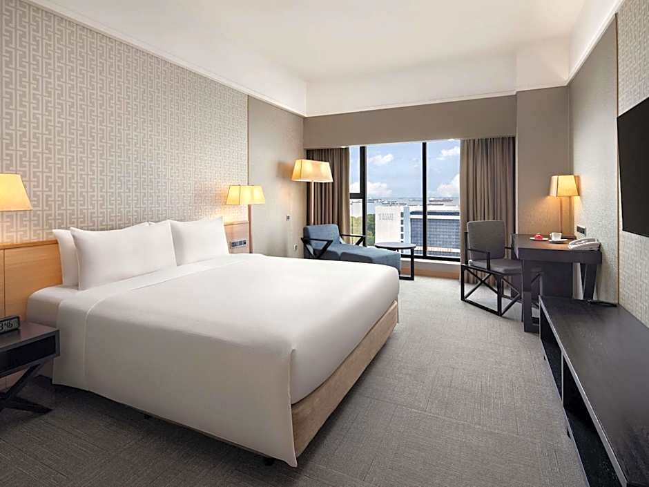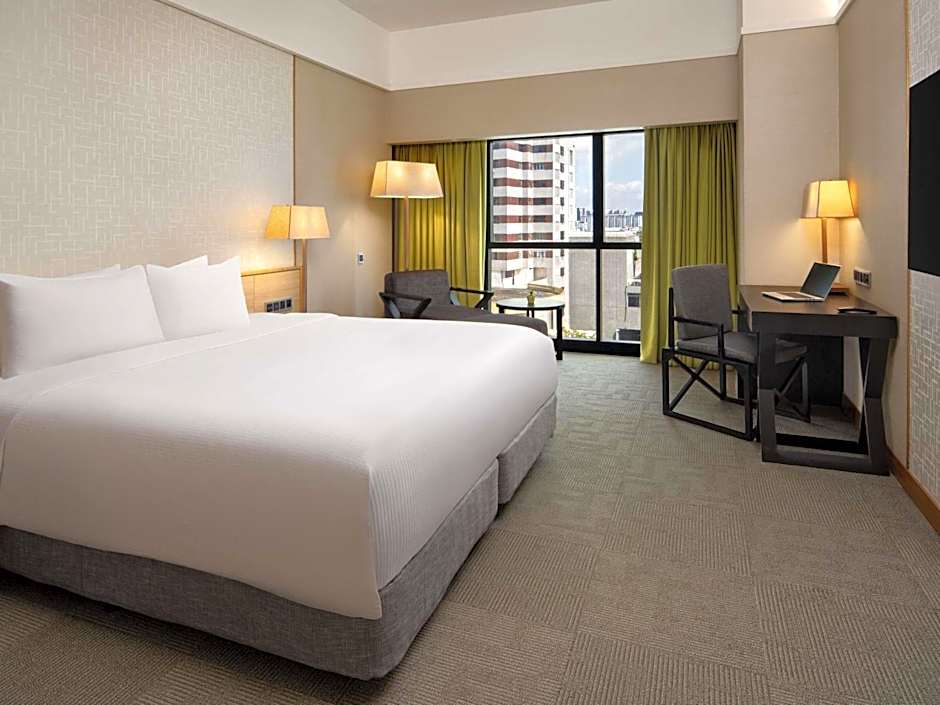 This spacious room offers city and pool views. The room is furnished with a flat-screen TV, coffee/tea making facilities, a refrigerator, and a safety deposit box. The private bathroom also comes equipped with a bathtub, bathrobe and toiletries. This room comes with a king-sized bed.