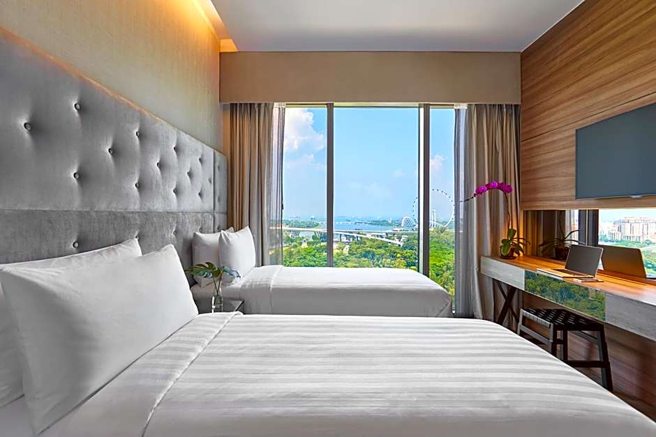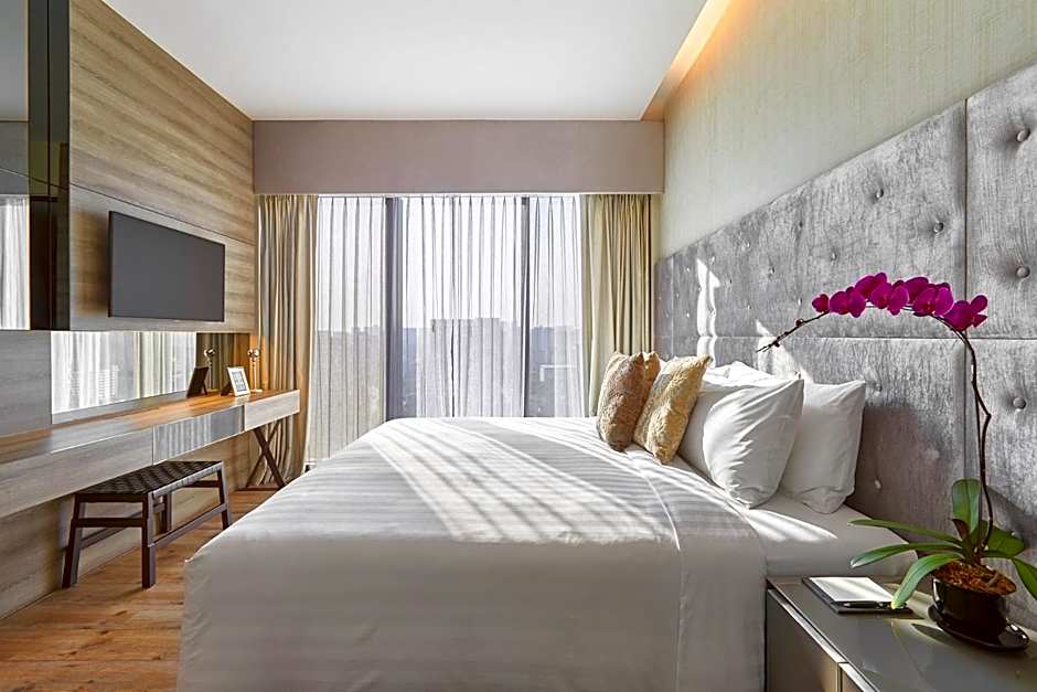 Overlooking Singapore Flier and the city skyline, this modern one-bedroom apartment comes with a separate living room, a flat-screen TV, DVD player and iPod docking station. Also includes Nespresso coffee machine, daily newspaper and private bathroom with rainshower facility.