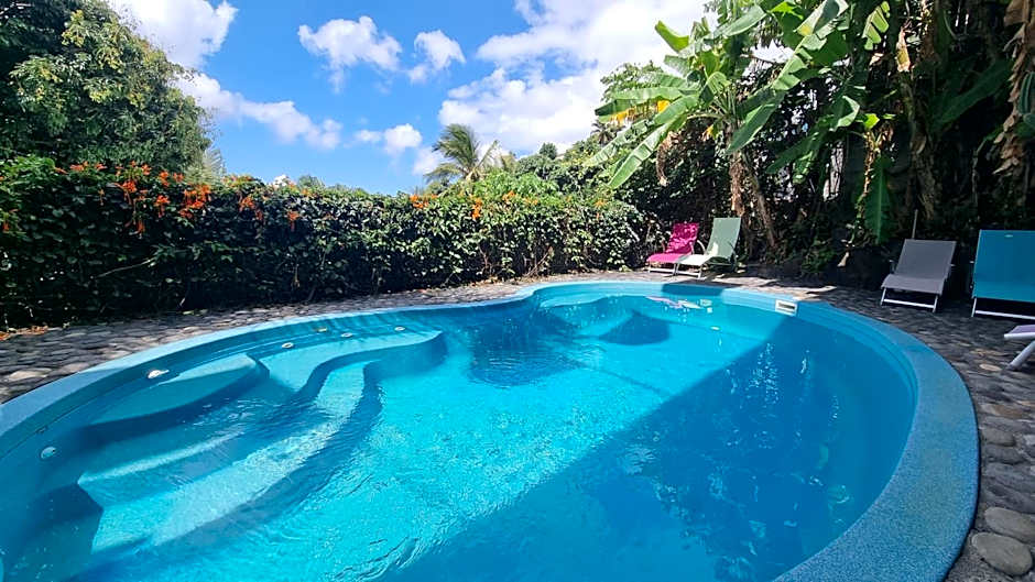 An inviting outdoor swimming pool glistens under the Réunion sun, with beach chairs and loungers free for guests to enjoy. Free private parking and on-site parking simplify arrivals, while a private entrance and terrace add privacy and charm. Garden views pair with a sun deck, inviting lazy mornings or sunset moments after days of island exploration.