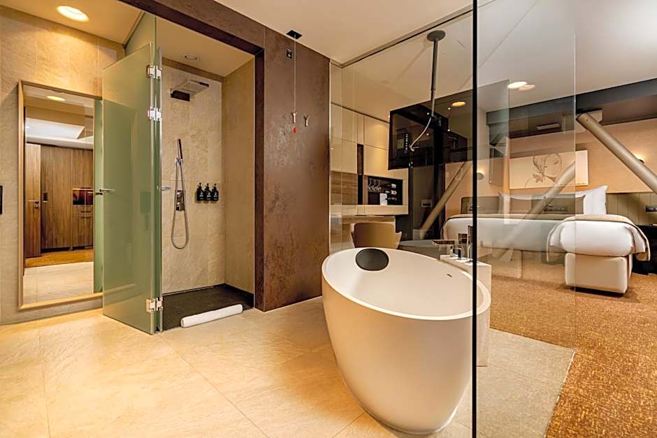 This suite has a soundproofing, bathrobe and seating area. Room rates include: - access to BELAQVA Spa and Wellness: fitness, indoor pool and jacuzzi. - a bottle of Prosecco, fruits and pralines MADAME PRALLINI, own production