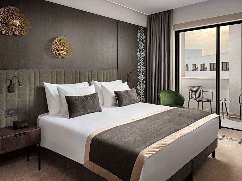 The hotel offers a variety of room types including One-Bedroom Double Suites with a sofa bed, Superior Twin Rooms with two twin beds, and Superior and Privilege Double Rooms with queen-size beds. All rooms have a capacity of accommodating either 2 adults and 1 child or 2 adults and 2 children and are non-smoking. Room sizes range from 237 sqft for the twin and double rooms to 355 sqft for the One-Bedroom Double Suite.