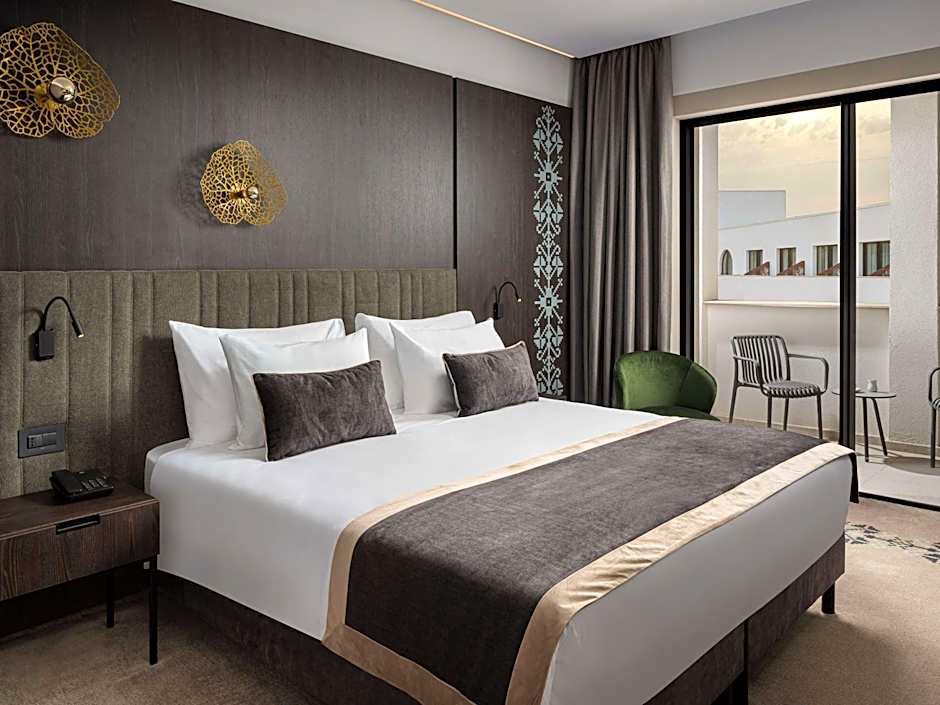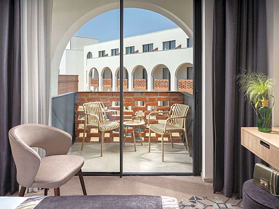 Until arriving there is nothing in the area to impress, but all change when you pass the doors inside. The courtyard is large and the building is very nice. The hotel is relatively new and the smell in the room was amazing. The floor cover in the hallways is comfy and the bed was great. It was my wife's birthday so I ordered special services which they did their best to offer. They even prepared a sweet surprise for my wife in the room with a special note from the staff. We appreciated it very much. The pool was clean and not at all crowded, but probably in weekends there are more people. The breakfast was ok, with a good variety for vegetarians (not vegans), fresh and tasty. The food in the restaurant was great also.