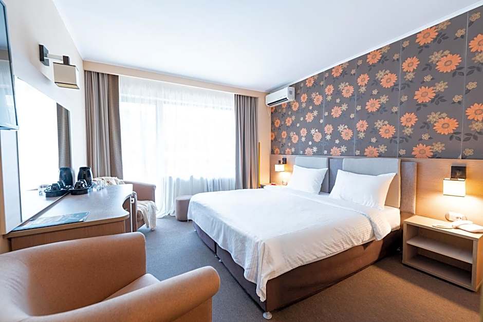 The Hotel Sinaia offers a variety of room types including doubles, twins, triples, and suites. All rooms are non-smoking and range in size from 151 sqft to 366 sqft. The rooms can accommodate 2 adults and 1 child, with some rooms able to accommodate larger groups. The bed sizes range from queen size to twin beds.