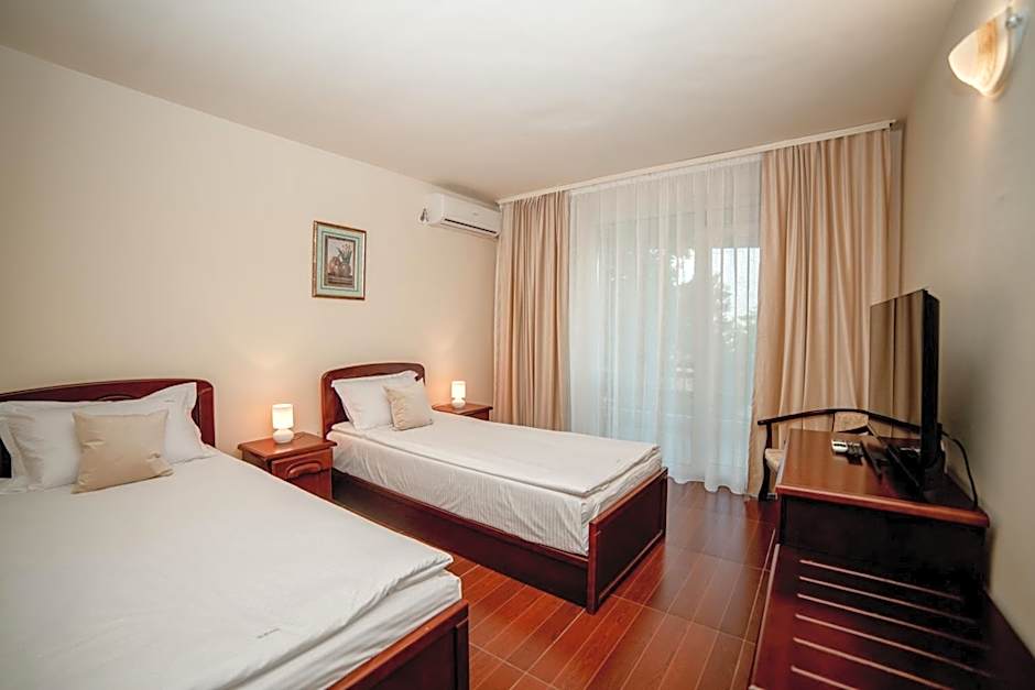 The location is good, not very far from the beach and on a quiet street. They offer breakfast in a separate location at the edge of the beach and we found the food there always fresh. The hotel itself is great for families with small children as they have a nice playground and shaded benches in the hotel yard. All rooms have AC which was a big help in the really hot August weather. The rooms were cleaned everyday. Even though there was no safe in the room the reception offers a safe service which we didn't use in the end even though we had a laptop and several other electronics with us that we left in the room.