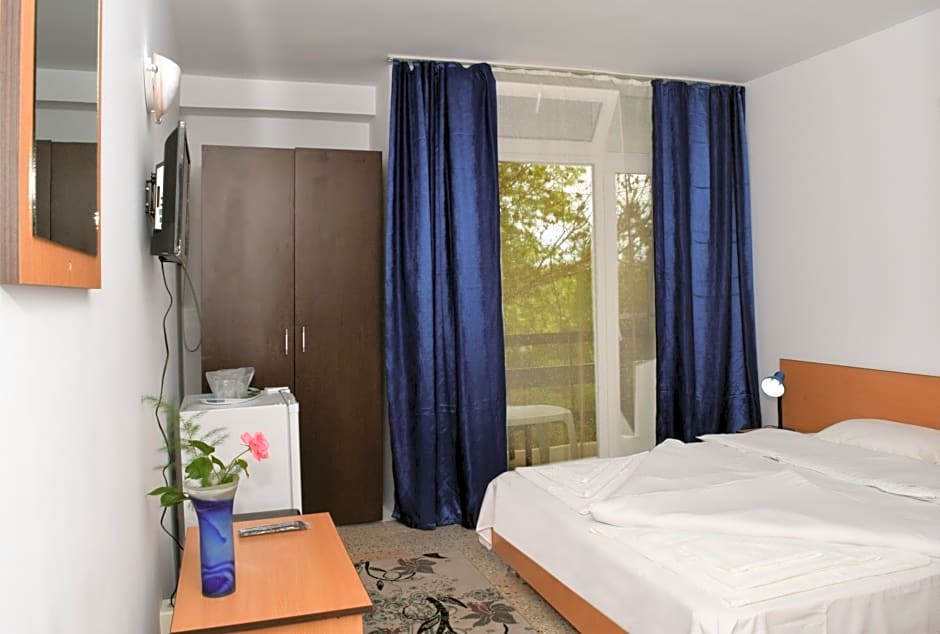 Loved it. For 2 starts it is absolutely the best that I've seen at the Romanian Seaside. Polite staff, super clean room and bathroom ( we have 2 kids, so I moved the beds near a wall, and underneath it was just as clean as the rest ), comfy beds ( the mattresses looked brand new ), nostalgic rocking chair in the balcony, with a small coffee table and an additional small chair, hanging thread to dry clothes and cable tv with cartoons :D. Fridge was very useful and worked properly. While the bathroom had a tad of old here and there, everything was perfectly functional and hot water was almost instantly provided ( unlike other 2 star communist marvels in which you'd have to wait and hope for hot water to take a shower). There was also AC available, but we didn't need it. I think there's an extra charge for it. However, if needed, it's there, which itself is an advantage. The wardrobe was a bit wobbly, so the clothes hangers would rattle when opening the door, but it wasn't too much of a problem. All in all, whatever small inconveniences I could find were as non-existent. This hotel redefines the concept of 2 stars hotel ( in my opinion, in Romania, at least ) and it's the best bang for your buck that you can get. There's a bar at the reception which, albeit a bit expensive, is very useful for sweets, snacks and beer :D. The outside yard has tables and a children's playground, which once again, were very pleasant surprises.
