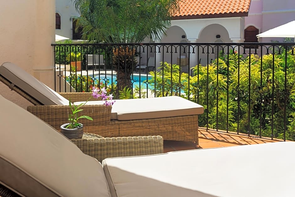 This villa overlooks a Spanish courtyard and pool with full kitchen, shared separate living/dining room and furnished balcony. The master bedroom suite interconnects with a Garden-View room and there is an adjacent Junior Suite with shared hallway. Air-conditioning is not available in living and kitchen areas.