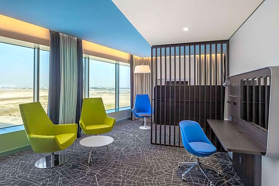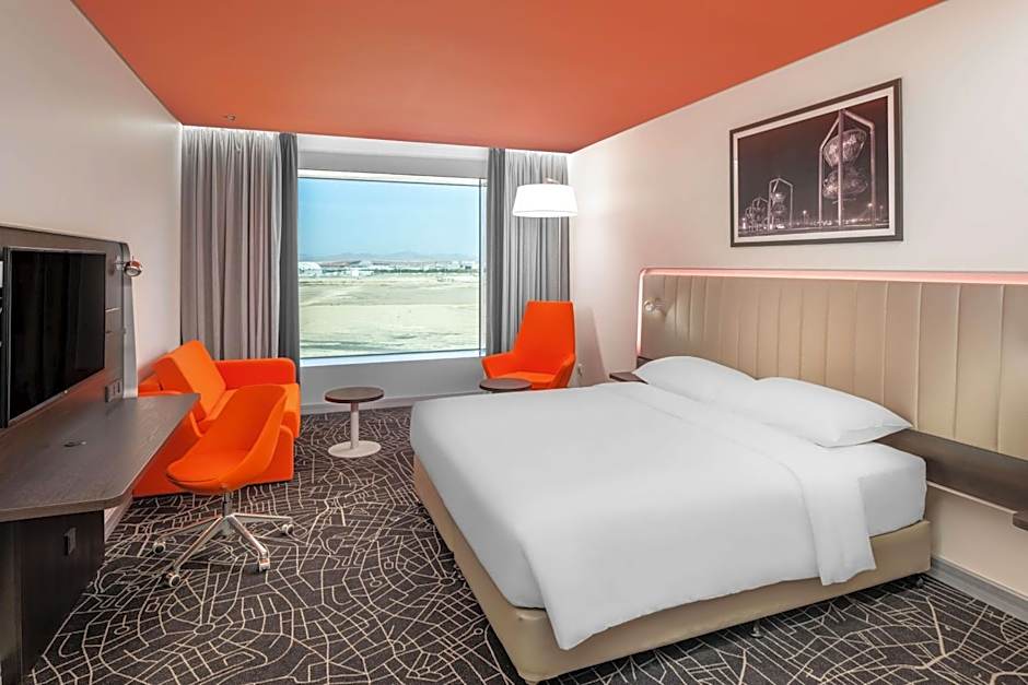 The hotel also offers standard rooms with airport views, with a room size of 291 sqft. These rooms can accommodate 3 adults and 2 children, do not allow smoking, and have 1 queen size bed.