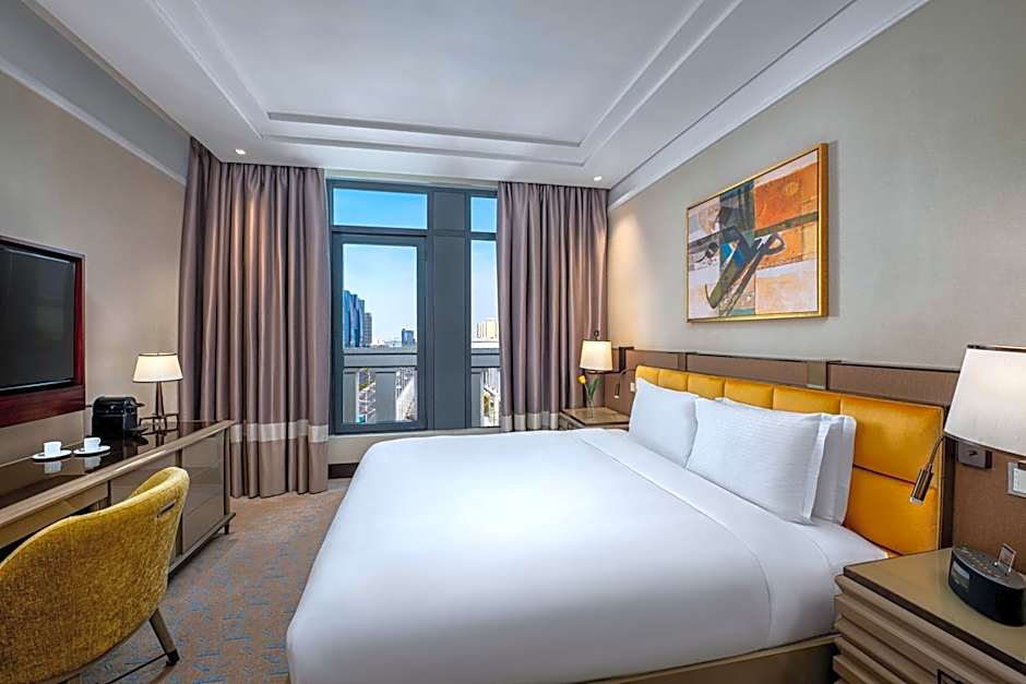 King Deluxe Room With City View is 355 square feet and includes a king-size bed 150-183 width plus hairdryer, tea and coffee making facilities , safe, and bathrobes.