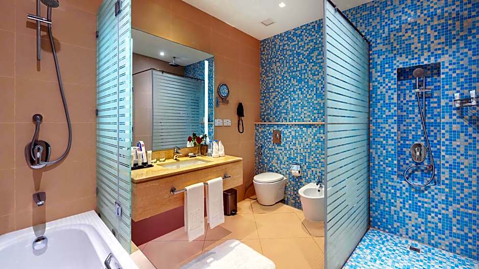For a delightful dining experience, guests need not venture far from their rooms. The hotel boasts two exquisite on-site restaurants to cater to everyone's taste. The Turquoise Restaurant provides a warm and family-friendly ambiance, offering a diverse range of international cuisines, ensuring that guests' appetites are thoroughly satisfied. For those desiring a more romantic setting, the Alsafina Sea Food Restaurant offers a modern and romantic atmosphere for indulging in delectable seafood dishes, making it a perfect spot for a special evening or intimate meal.