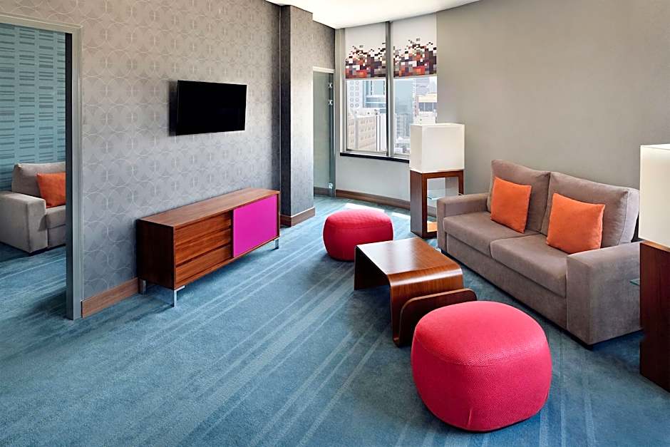 aloft, Suite, 1 King Bed is 54 square feet and includes a double bed 131-150 width plus extra beds on demand, desk, hairdryer, tea and coffee making facilities , ironing set, safe, bathrobes, and slippers.