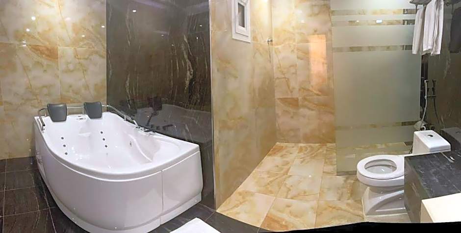 This suite's standout features are the hot tub and spa bath. This spacious suite includes 1 living room, 1 separate bedroom and 1 bathroom with a walk-in shower and free toiletries. The well-equipped kitchenette features a stovetop, a refrigerator and a microwave. The suite has tiled floors, a seating area with a flat-screen TV with satellite channels, air conditioning, a tea and coffee maker, as well as a dining area. The unit has 1 bed.