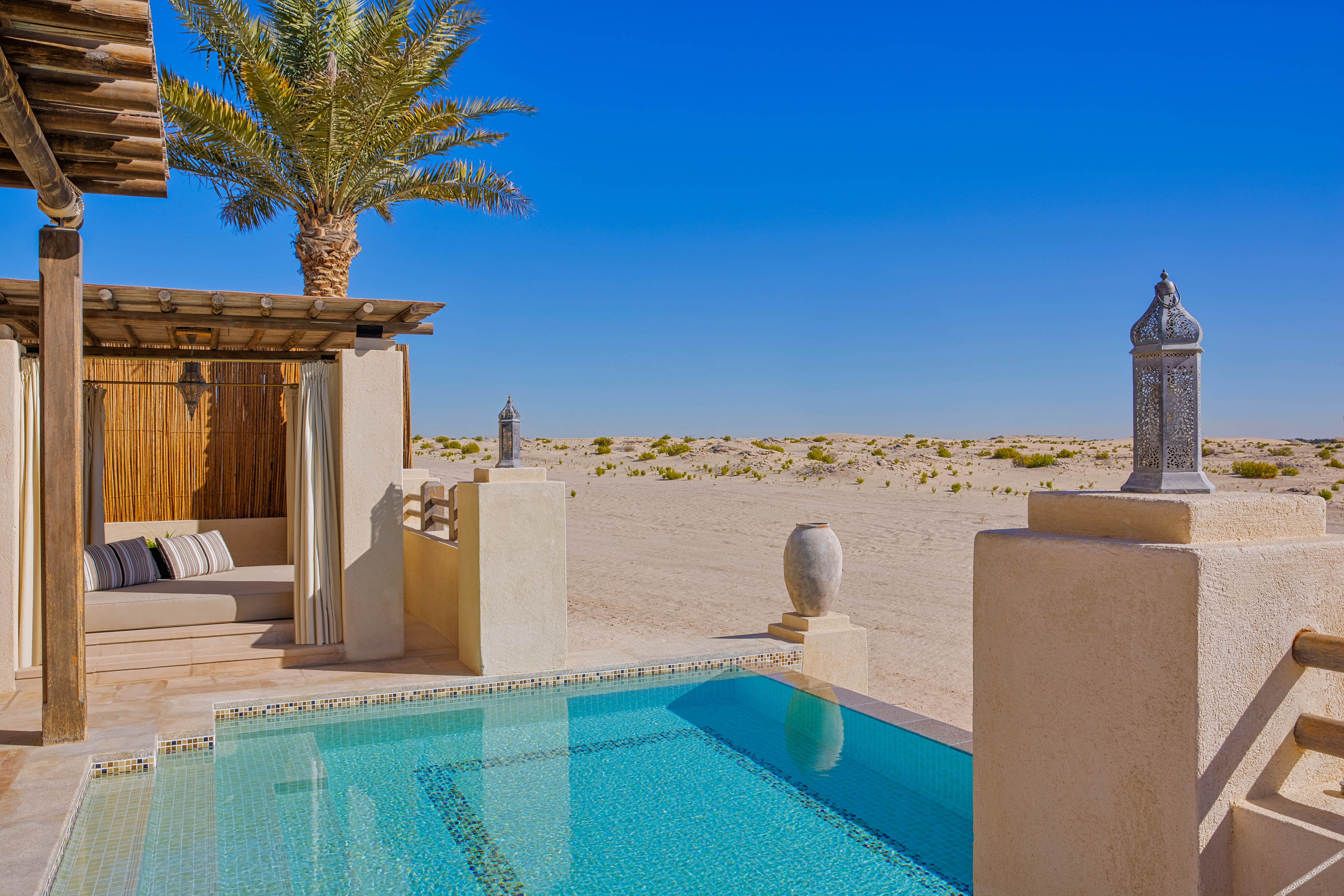 The 45 sqm room offers desert landscape views and is decorated in neutral tones and Arabesque inspired accessories.