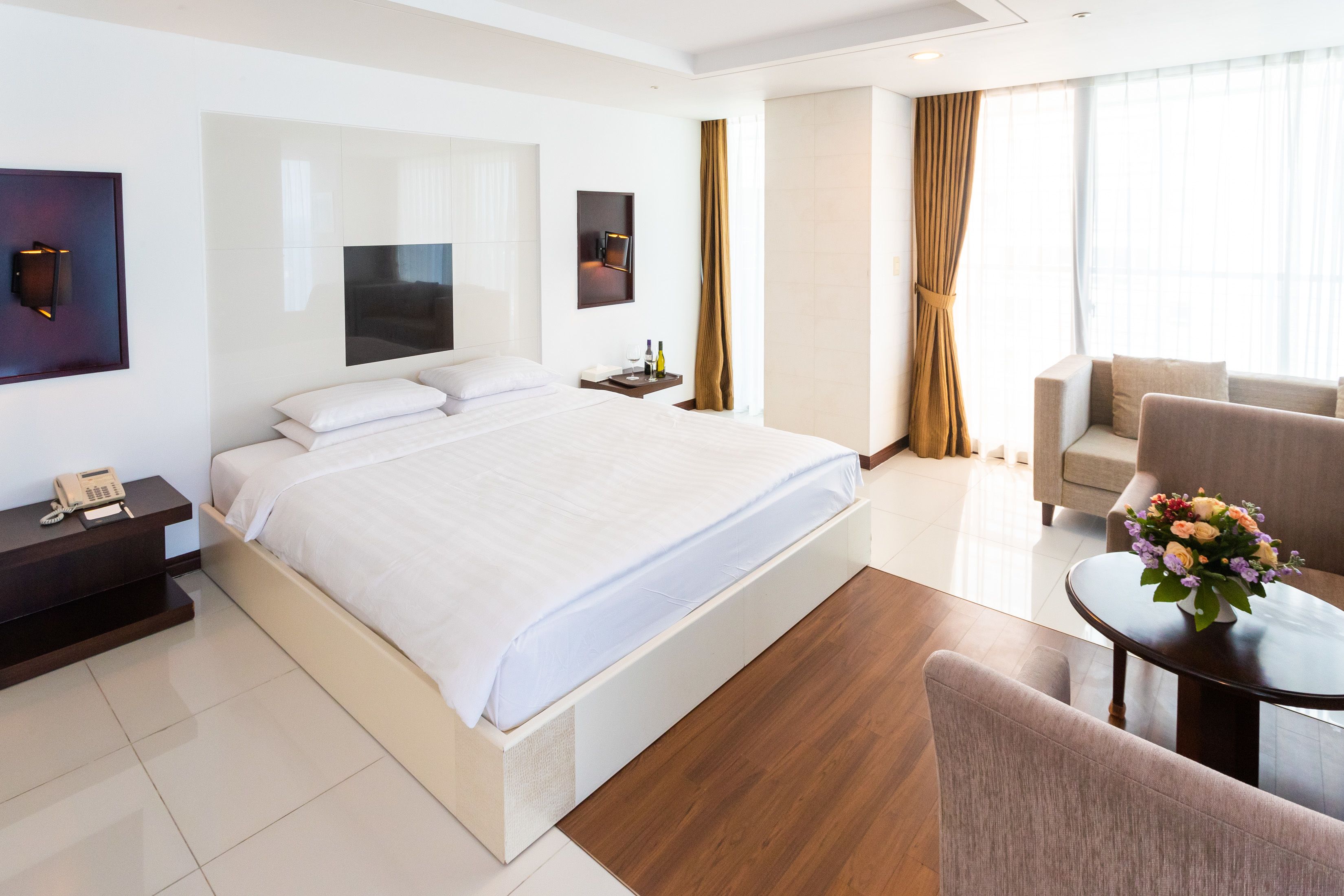 At the Sunset Business Hotel, guests can choose from a variety of room types including suites, doubles, and twins. Smoking is not allowed in any of the rooms. The occupancy ranges from 2 adults and 1 child to 4 adults and 2 children. The bed sizes vary from double beds to queen size beds, with some rooms also offering twin beds and futon mats.