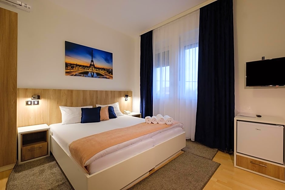 This is a small, modest but very comfortable hotel only about 20 minutes drive from the airport. Our ground floor room was spacious and immaculately clean with modern amenities. The shower was very high tech! The internet and air-conditioning worked well. The airport pick-up and drop-off worked well and the driver kindly waited well over an hour for our very late plane to arrive. For dinner we went to a fabulous traditional Serbian restaurant just 200m walk from the hotel. Ask reception for directions.