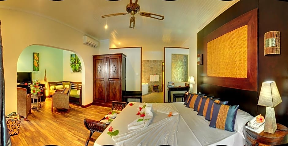 Footsteps from the shore, the beachfront setting pairs with an inviting outdoor pool and a terrace that overlooks a lush garden—the perfect backdrop for sunlit mornings and sunset sips. Snorkeling can be arranged for an extra charge, and handy shuttle services to the airport or around town help make island hopping a breeze.