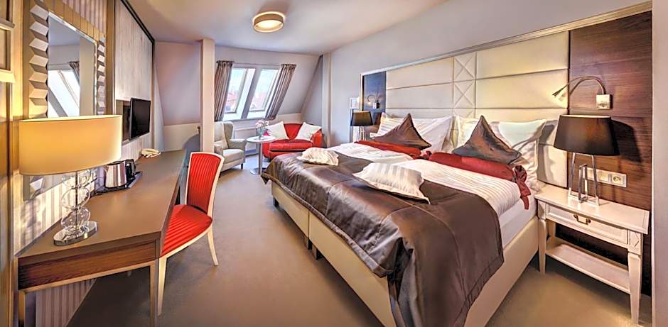 Spacious and stylishly decorated suite with a seating area, a flat-screen satellite TV and a mini-bar. Its private bathroom is provided with bathrobes, slippers and a hairdryer.