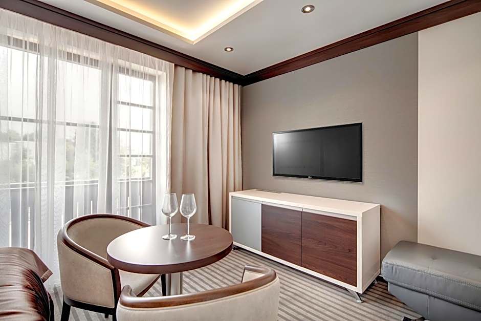 This suite is located on the ground floor has a seating area and a bathrobe.