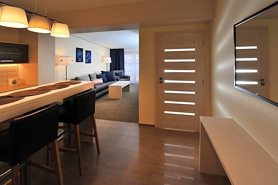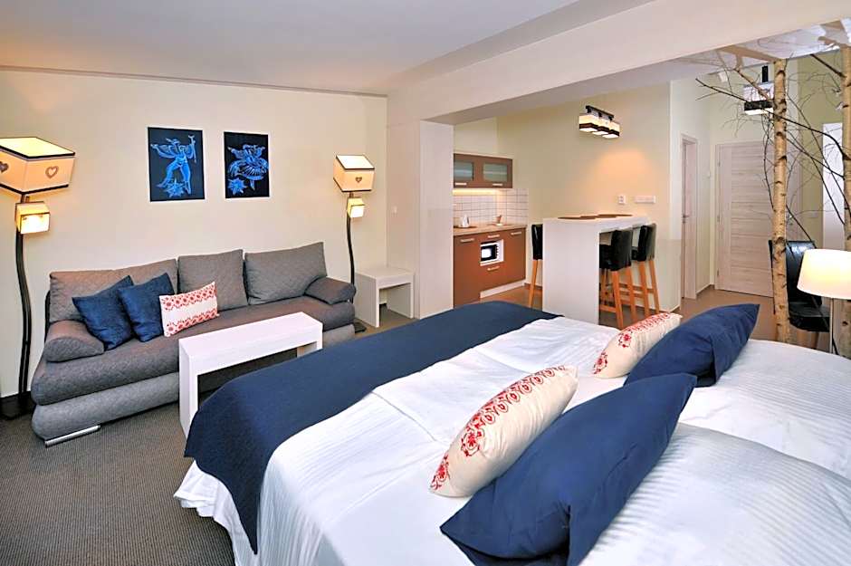 Room options include a Studio (323 sqft) accommodating up to 4 adults and 1 child with 1 double bed, 2 sofa beds, and 2 twin beds; a Studio, Double/Twin (323 sqft) with the same capacity; and an Apartment (409 sqft) for up to 4 adults and 1 child with 1 double bed and 1 sofa bed. These layouts offer flexible space for families and groups seeking comfort after days in the mountains. Skiing is a featured amenity, and Starý Smokovec's center is just a short walk away, making it easy to combine outdoor adventures with easy access to shops and eateries.