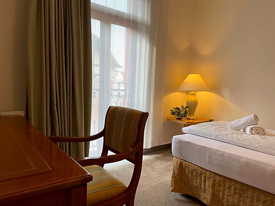 Great location (couple of minutes from city center, walking distance to train station and bus station) yet the place was quiet. Room was older but well maintained (for the most part), top cleanliness. Bathroom was spacious with a shower. Breakfast was nice, staff friendly.