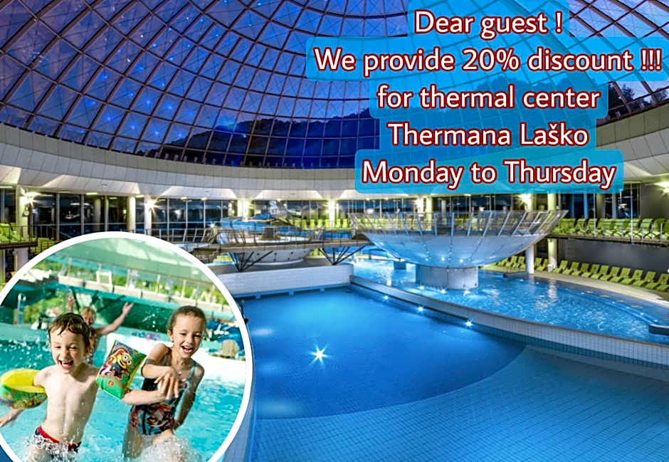 This package includes: - Breakfast - A 10 EUR voucher for wellness services; - 20% discount on the Thermal SPA Center Laško and Rimske Terme; - 3 hours bike rental. - Welcome ice-cream and juice for children. - Free parking.