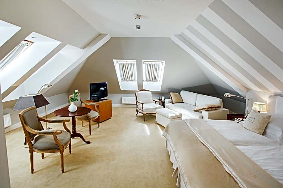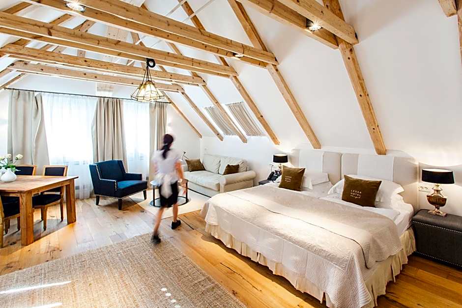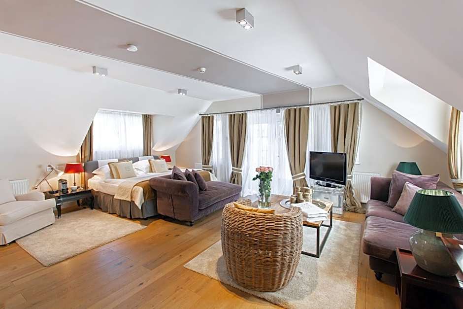 A luxurious suite with a marvelous view to Gornji trg, decorated in a modern classic style. It features a fireplace in the living room.