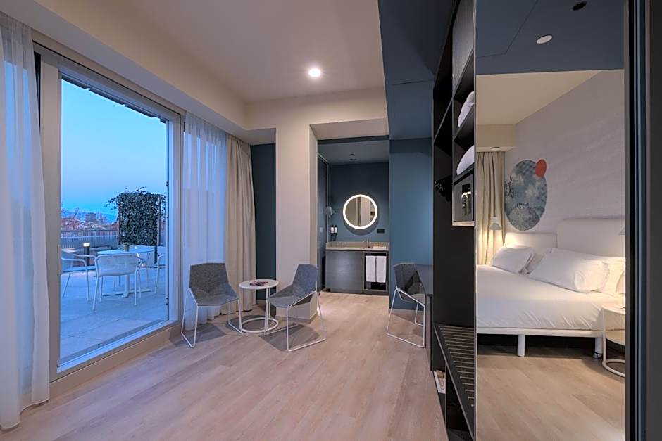 Yes, the hotel has a restaurant on site named La Santa Maria Tapas Bar. The restaurant offers a modern ambiance and serves Mediterranean cuisine.