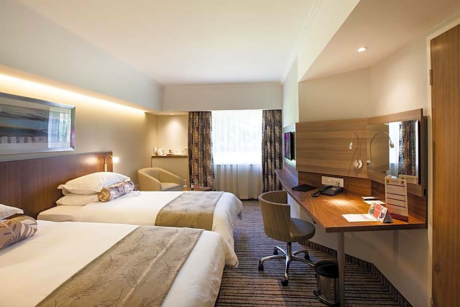 There is a good restaurant in the hotel, with plenty of choice on the menu for lunch and evening meals. Also the choices for breakfast, with options for continental or full English, were excellent. The staff were very helpful and extremely friendly. I chose the hotel because it looked like it had secure parking for our cars, and it did. The entire site was very secure with security guards checking cars in and out. The rooms were clean, comfortable and overall the hotel is very well maintained.