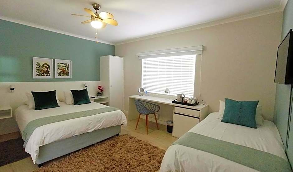 This stylish room features a private bathroom with shower, a ceiling fan and an electric heater. There is a mini bar fridge, tea/coffee facilities, a small work desk and a LED Smart TV. This room has access to the shared lounge and living room on the ground floor with views of the Promenade, Atlantic Ocean and Robben Island.