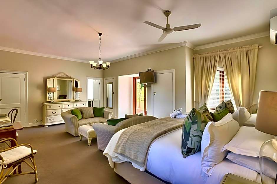 Located upstairs in the Manor House, this large open plan executive suite offers a king-sized bed and en-suite dressing room. It has a seating area with two sofas and an ottoman. The bathroom features a glass vanity, bath and separate shower. French doors open onto the veranda which offers mountain views.
