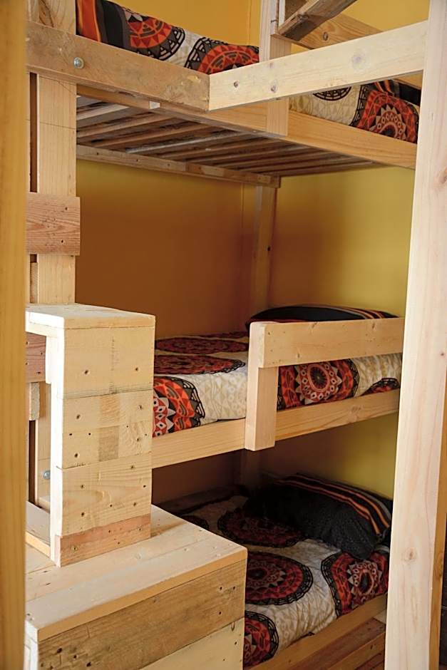 Bed in a dormitory room with bunk beds. The room has a access to a shared bathroom.