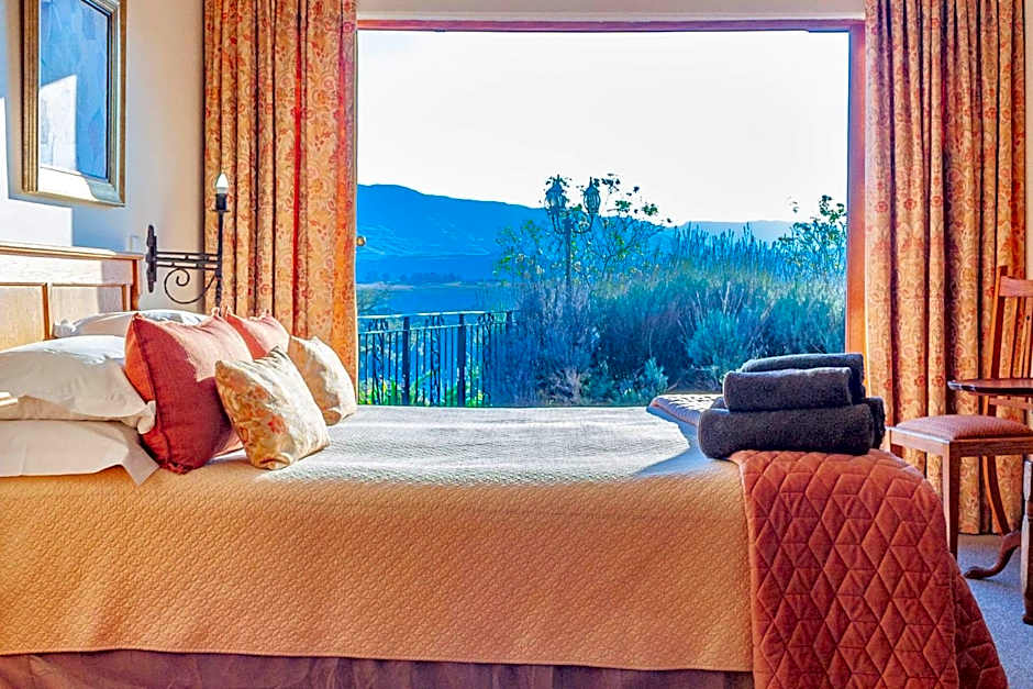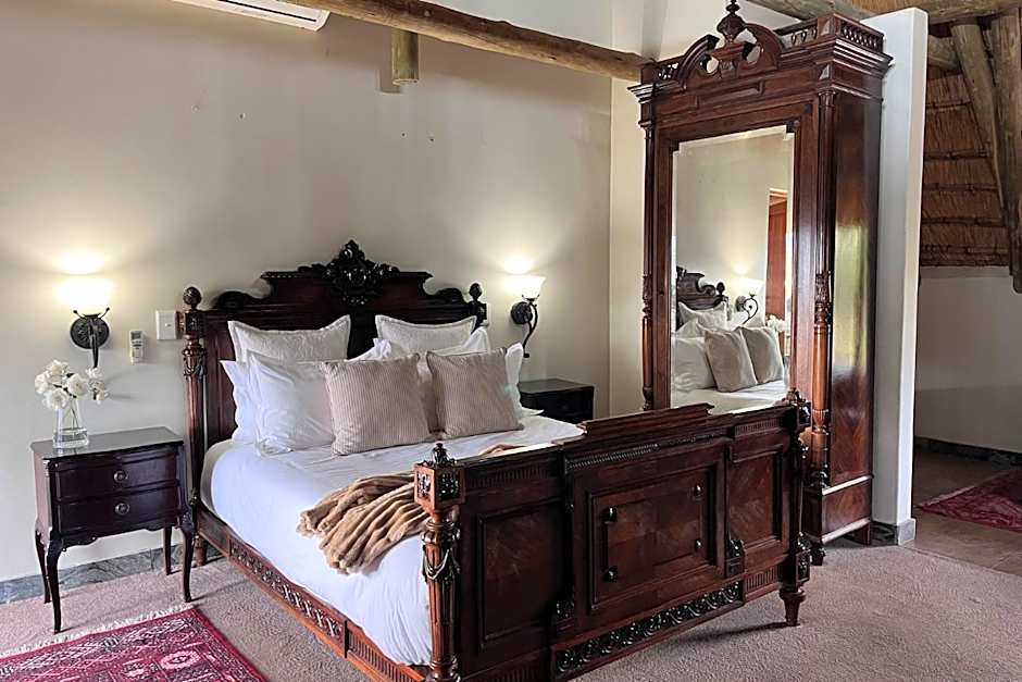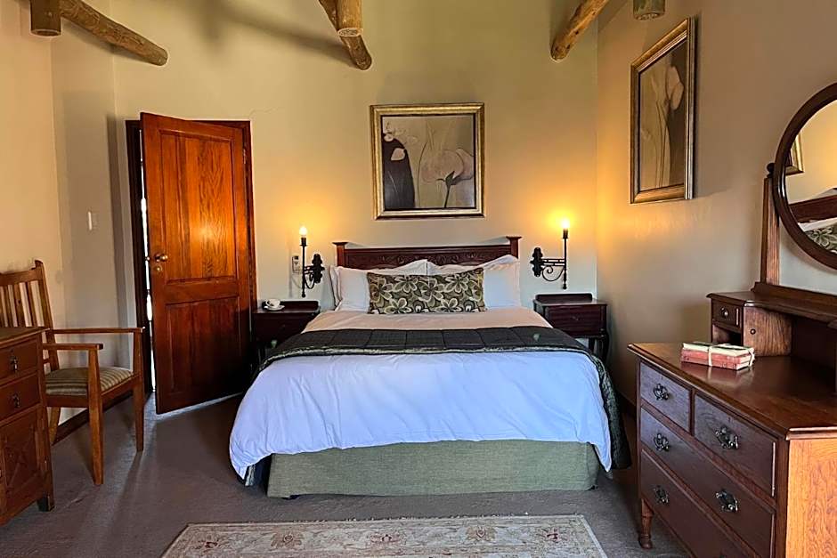 Double Room with Balcony. The signature cupboard, dressing table and two chairs were utilized by a British Colonel during the Boer war, on the foothills of Majuba. The double bed is queen sized and the room opens onto a personal balcony overlooking the pool and it's spectacular views.