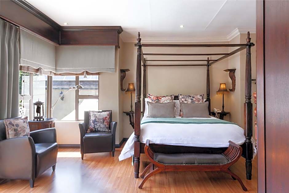A spacious suite with a luxury canopy bed and a spa bath.