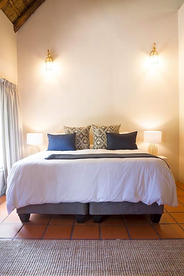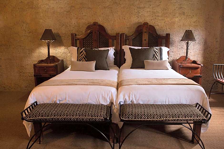 The Bush Lodge consists of 15 rooms with Double/Twin beds, private bathrooms (shower or bath). Each room includes tea/coffee station, bar fridge, ceiling fan, hairdryer, comfy sitting area, and access to a shared pool, Boma area, restaurant, and bar.