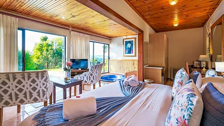 Suite with large bed, bathroom with spa bath and garden and mountain views.